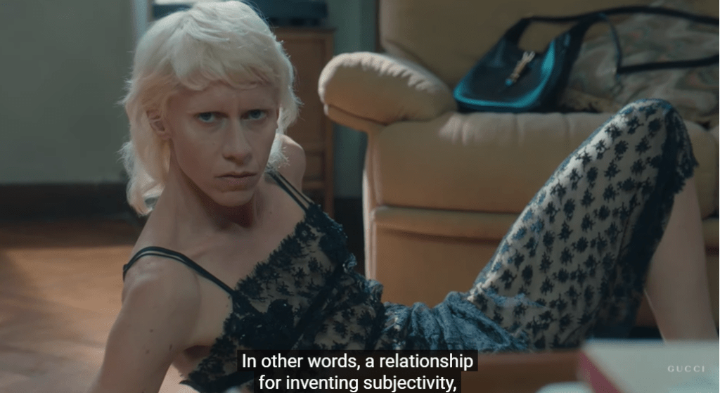 E’ questo contesto che la protagonista incarna quello che lo scrittore e filosofo transgender Paul B Preciado racconta da una TV gracchiante: “L’invenzione di una coscienza alternativa, una relazione di soggettività, dissente del genere”.