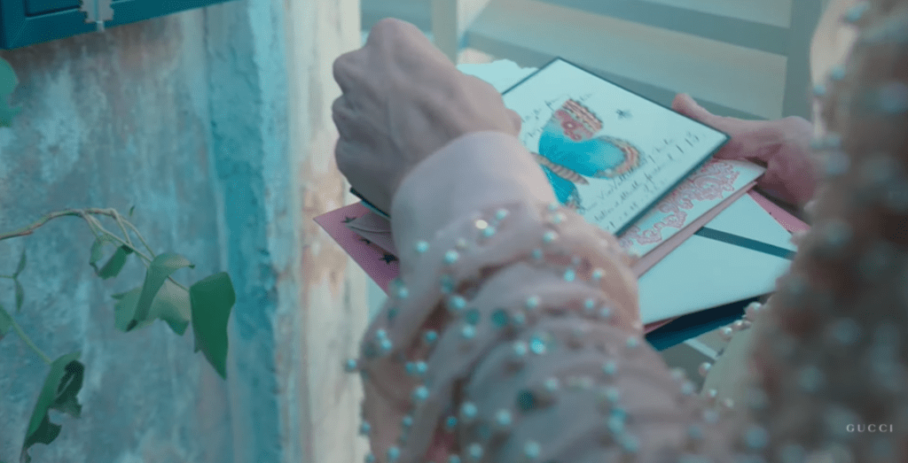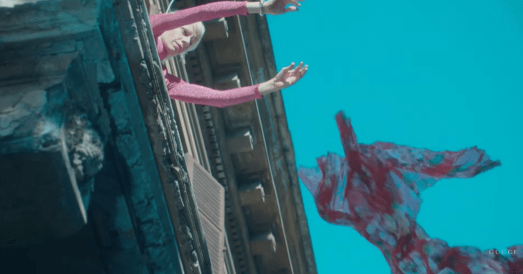 Come racconta HarperBazar: “La protagonista si aggira per un appartamento romano con una tuta in tulle trasparente nella quale dormiva, indossa poi un abito in stile anni 70 a tinte pastello, decorato da cristalli. Completa il look con una cuffietta rosa tempestata di paillettes. Scende a prendere la posta e dentro ci trova gli inviti alle sfilate Gucci degli ultimi 5 anni.Una volta tornata in casa, getta dal balcone un vestito di seta rossa a motivi floreali. Appartiene alla prima collezione di Alessandro Michele per Gucci, l’Autunno/Inverno 2015.