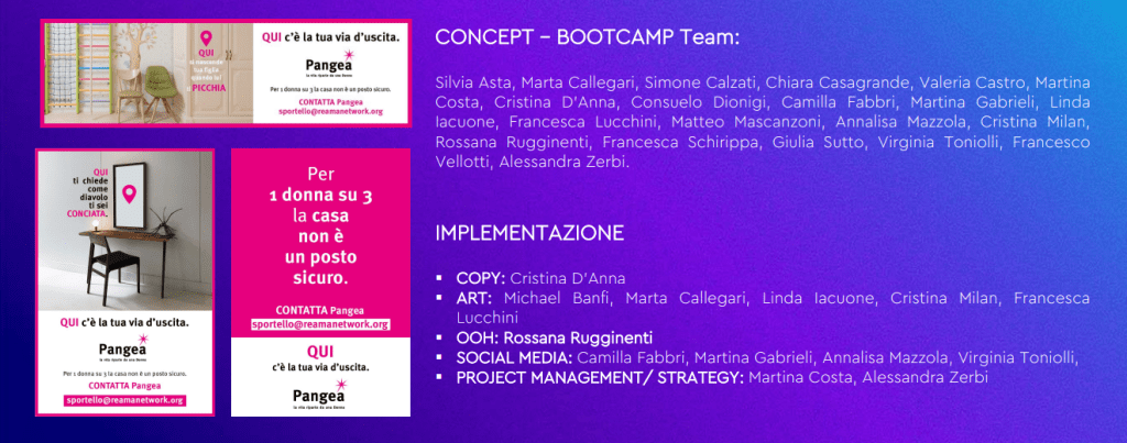 Partendo da queste considerazioni un gruppo di uomini e donne, esperti di comunicazione di tutte le agenzie del Gruppo WPP in Italia, ha lavorato insieme in un Bootcamp con l’obiettivo di creare una campagna pro bono contro la violenza sulle donne a supporto di Fondazione Pangea Onlus . La Fondazione ha fatto dell’aiuto alle donne la prioria missione: dall’Afghanistan all’Italia Pangea offre aiuto concreto alle donne per sfuggire dalla violenza e riconquistare la propria indipendenza psicologica, economica e sociale.